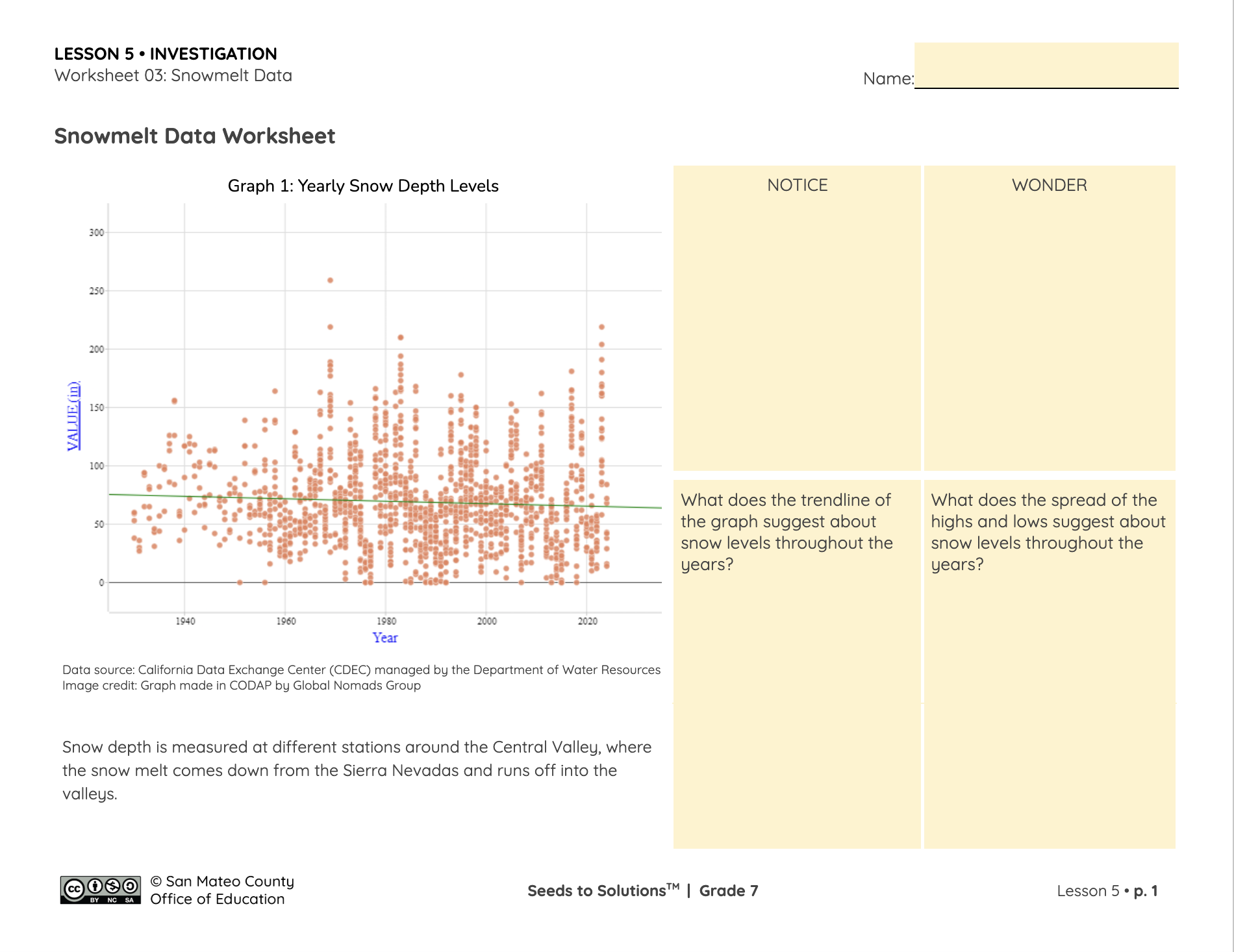Seeds to Solutions is a set of unique, solutions-focused K-12 climate curriculum by Ten Strands, developed especially for the state of California. I worked with Global Nomads Group in particular to develop the 7th grade unit in particular, which starts with exploring land subsidence in California’s Central Valley to open into the broader issue of aquifer management. I developed this curriculum not only by distilling research on aquifer depletion into understandable lessons, but working with primary datasets on USGS precipitation data, primary historical documents on water management, and interviews with field experts in geology, farming, and advocacy. By utilizing backwards mapping, storyline-based design, and accessibility principles, I designed this curriculum to teach students how to model complex scientific phenomena, but also connect scientific issues to their roots in political and social systems. Over two years later, this unit is now published and available for anyone to use for free.